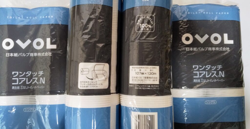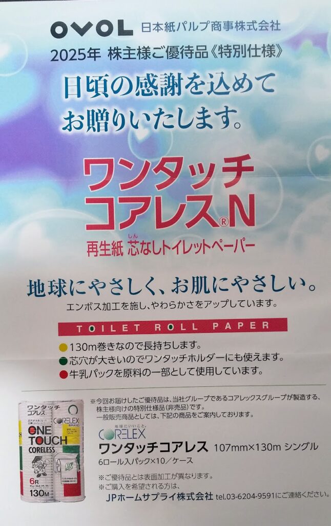500株の保有なので、『ワンタッチコアレス®N 再生紙芯なしトイレットペーパー(シングル130M×24ロール[芯なし])』が届きました。