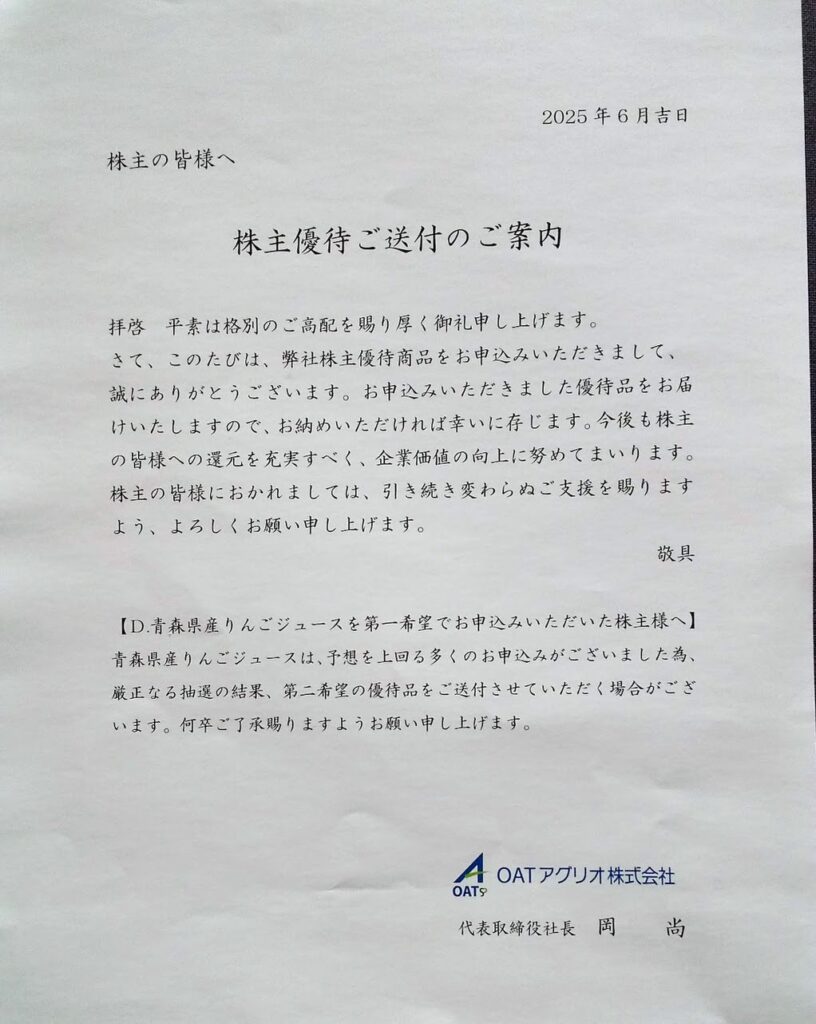 | 100株以上 | A.家庭園芸用肥料と美咲 合計4本セット(2,500 円相当) B.花とみどりのギフト券(2,000 円分) C.オレンジジュース1本(紅まどんな720ml ✕1本) D.リンゴジュース2本セット(1,000ml×2本) 上記4品目の中から1つ選択 | A.家庭園芸用肥料と美咲 合計4本セット(2,500 円相当) B.花とみどりのギフト券(2,000 円分) C.オレンジジュース1本(紅まどんな720ml ✕1本) D.リンゴジュース2本セット(1,000ml×2本) 上記4品目の中から1つ選択 + 1,000 円のクオカード | A.家庭園芸用肥料と美咲 合計4本セット(2,500 円相当) B.花とみどりのギフト券(2,000 円分) C.オレンジジュース1本(紅まどんな720ml ✕1本) D.リンゴジュース2本セット(1,000ml×2本) 上記4品目の中から1つ選択 + 3,000 円のクオカード |